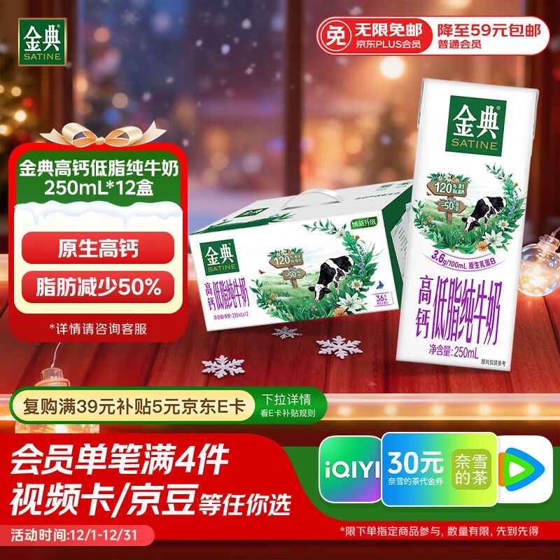 伊利 金典高钙低脂纯牛奶整箱250ml×12盒