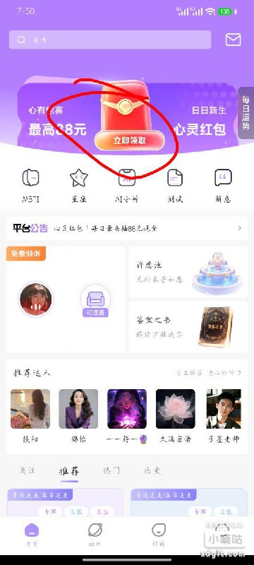 🚦 应用商店搜索下载心灵宇宙,手机号登录,横幅领取一包1.58,做任务也有包,拉1小号有2r,只能拉一,拉多了上限