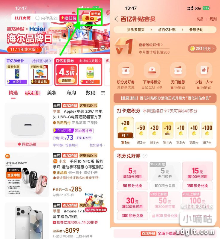 签3天兑换5元无门槛券】拼多多APP首页“百亿补贴”->右上角“会员”->签到3天共100积分,兑换5元无门槛券