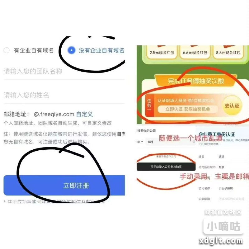 #小程序://自如/AZ3ALhpP1LEeMcm打开去职场认证,很简单就是随便乱打几个字你会发现没有这个公司,然后他让你手动录入,这个时候你就点手动录入,姓名公司名称随便编,然后填上刚才注册的网易企业邮箱号,输入验证码认证完成返回抽奖